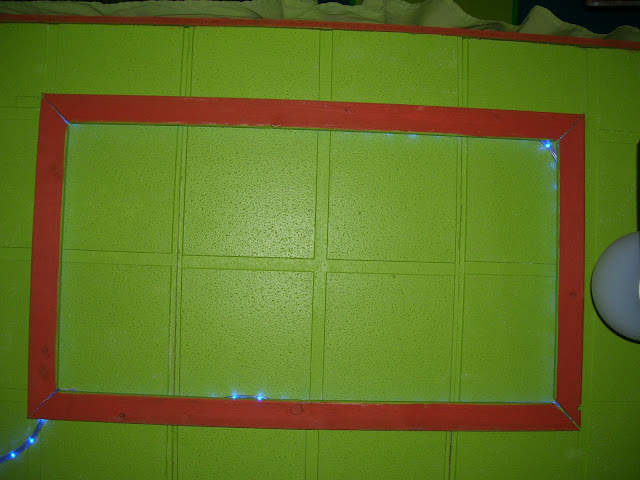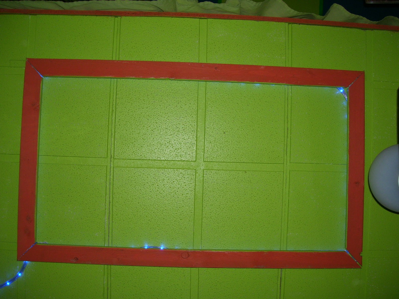 Pour crée une vrai ambiance de salon, j'ai installé un plafond suspendu en dessous de son lit et pour l'éclairage je lui ai encastré une lumière bleu.