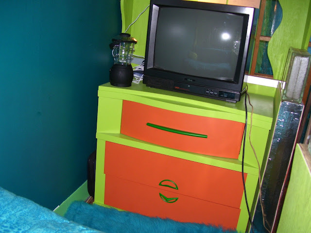 Ici, j'ai pris une ancienne commode et je lui ai enlever une étage et je l'ai peinturé.