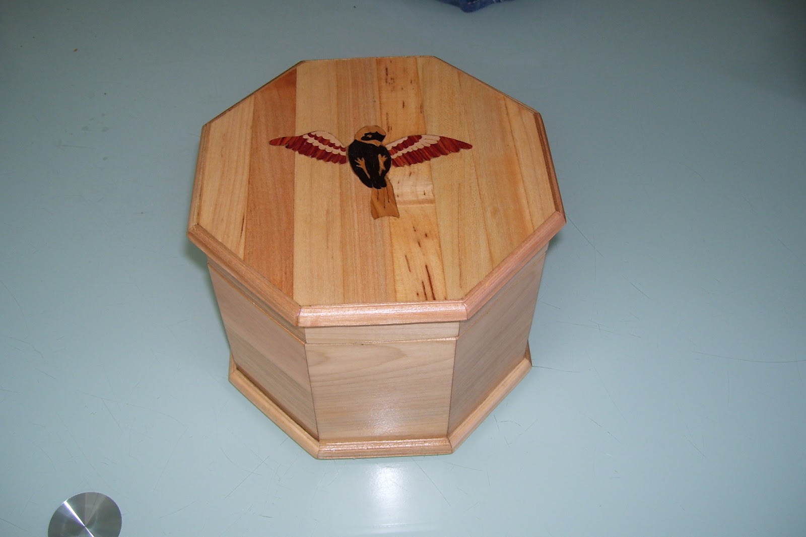 Voici un coffre à bijoux avec une marqueterie dessus.